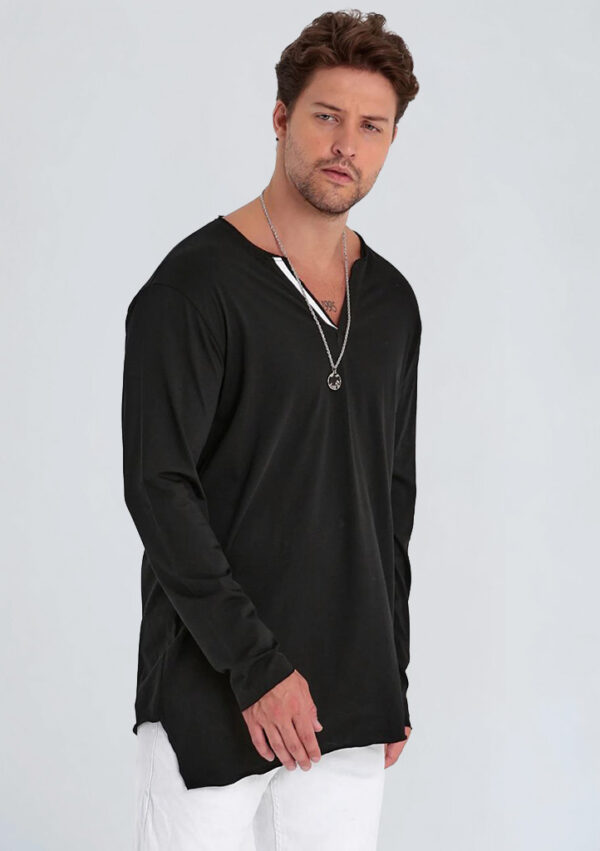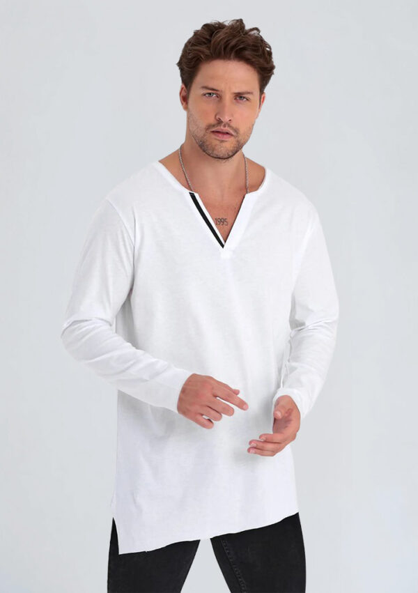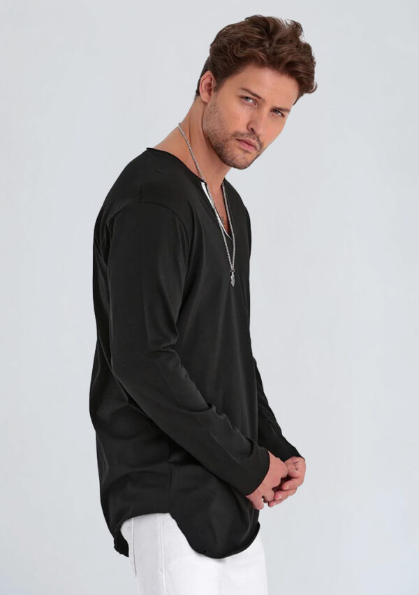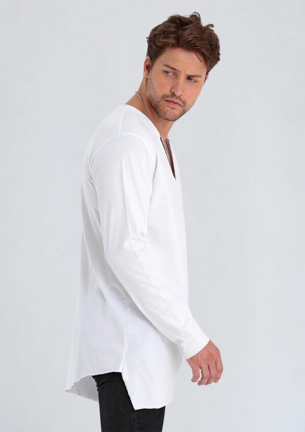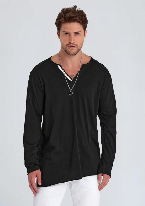 Asimetrik V-yaka tasarımı ile sade ama etkili bir görünüme sahip bu uzun kollu tişört, rahat kesimi sayesinde konforlu bir kullanım sunar. Kumaşının yumuşak dokusu, gün boyu ferah his sağlar. Rahat silueti, farklı alt giyimlerle kolayca kombinlenebilir ve günlük stilin tamamlayıcısı olarak kullanılabilir. Ürün, klasik tişörtlerden farklı olarak V-yaka detayıyla modern bir görünüm oluşturur.
