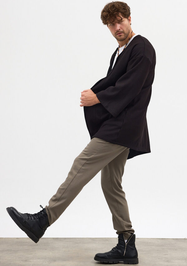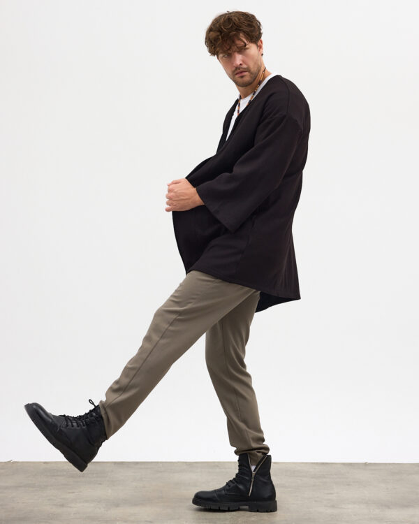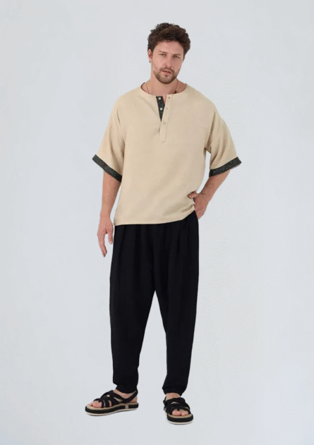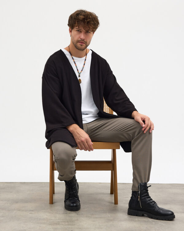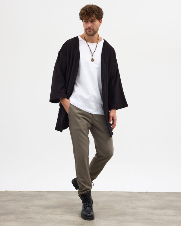 Pantolon, slim fit yapısıyla vücudu saran ama hareket özgürlüğü bırakacak şekilde tasarlanmıştır; keten dokusu sayesinde yaz günlerinde ferah bir kullanım sağlar. Kimono, oversize kesimiyle salaş bir hava katar; katmanlı kombinlerde hafif bir dış yüzey olarak görev alır. Tişört ise dengeli bir arakatman olarak göze çarpmayan şıklığı takıma ekler.